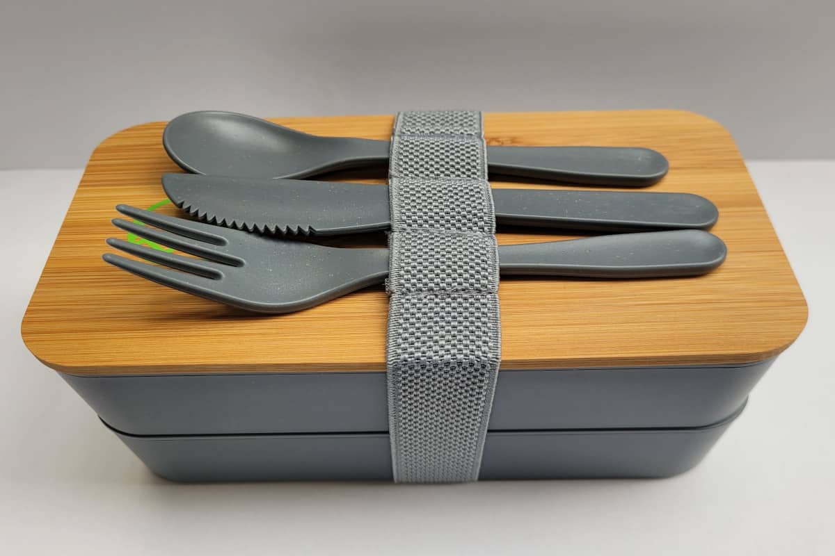 | Produkteigenschaften | – Funktionelle Doppel-Lunchbox mit Deckel und Besteck |